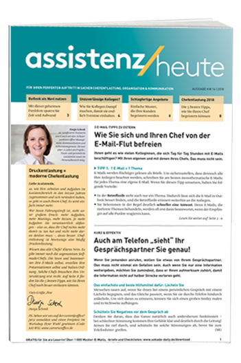 Wenn Sie noch heute Ihren kostenlosen Ratgeber gratis anfordern, schenke ich Ihnen die aktuelle Ausgabe! Das macht Ihre Entscheidung doppelt wertvoll, denn mit Ihrer Gratis-Ausgabe profitieren Sie kostenlos von den neuesten Expertinnen-Tipps, Schritt-für-Schritt-Anleitungen, Musterbriefen und Argumentationshilfen, Lösungen und neue Herangehensweisen für alle zeitgemäßen Assistenzaufgaben.